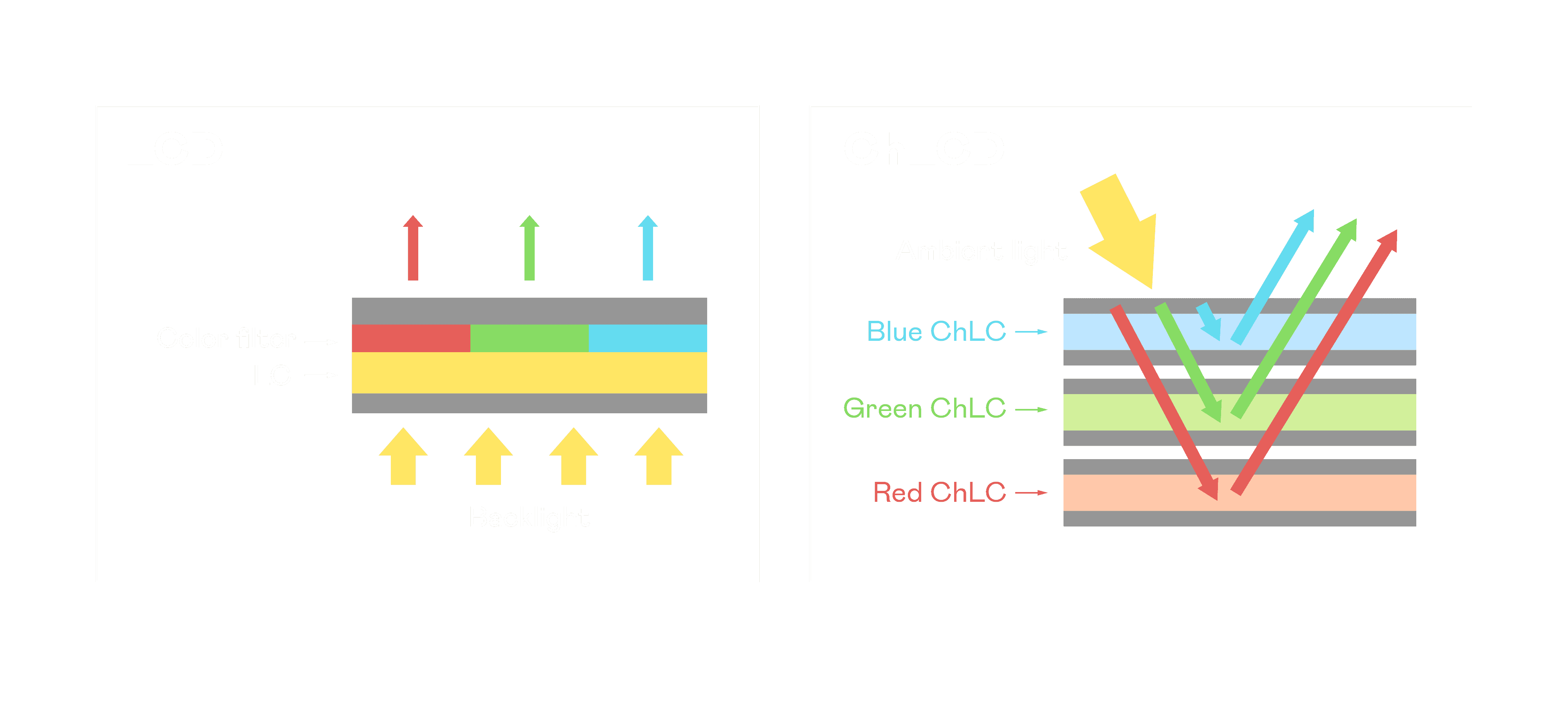 ChLCD 胆固醇液晶就如同纸张一样,,,,透过反射环境光来显示影像,,因此长时间观看不易造成人眼视觉疲劳,,,,可达到护眼效果。。当处于户外阳光下使用,,,LCD 影像容易失真而不易观看,,,,但胆固醇液晶仍可维持较佳的影像品质。。。。