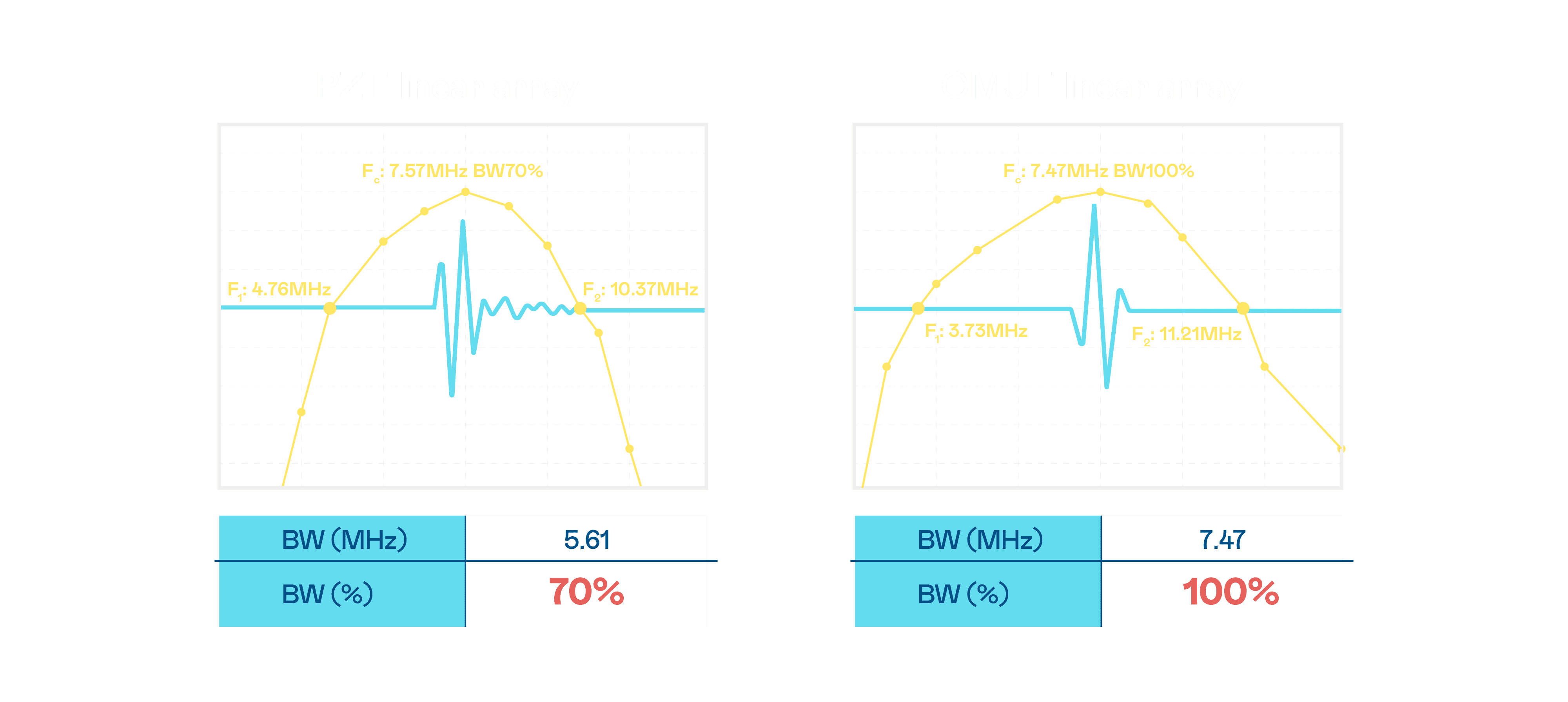 超音波影像的解析度高低,,首先取决于探头能发出的讯号频宽。。。。尊龙集团 CMUT 可提供高清晰的超音波讯号,,提供高频宽、、高灵敏度、、影像纹理细节更高的超音波影像,,,,协助医护人员缩短影像判读时间及利用精准的医疗影像进行诊断。。。。